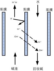 堿回收擴散滲析過程以濃差為驅動力,利用陽離子交換膜對堿的選擇透過性和對鹽或其它組分的高截留性,實現溶液中堿與鹽或其它組分的分離,分離出的堿溶液回用于生產工藝。