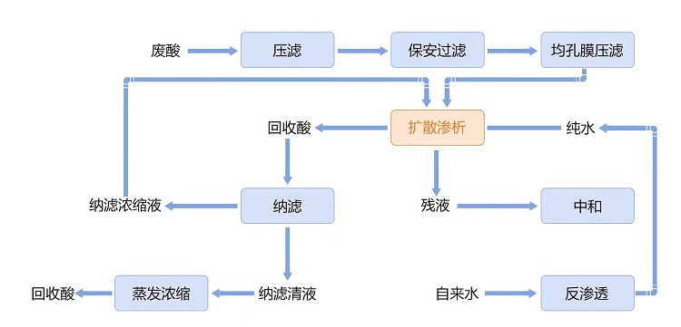 該項(xiàng)目以擴(kuò)散滲析技術(shù)為核心,將微濾、擴(kuò)散滲析和納濾等過程耦合。采用微濾工藝作為預(yù)處理,采用山東天維膜技術(shù)有限公司自主研發(fā)的高性能擴(kuò)散滲析膜實(shí)現(xiàn)硫酸回收并除去亞鐵離子,采用納濾工藝實(shí)現(xiàn)亞鐵離子的拋光處理,最終實(shí)現(xiàn)鈦白粉副產(chǎn)廢硫酸的資源化回收利用。